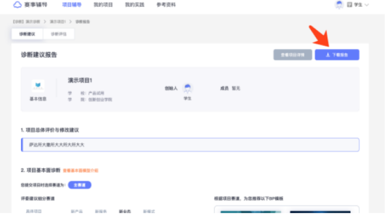 项目诊断建议报告为项目参与诊断活动第一阶段后获取的评委反馈报告,登录简创云平台( www.jc-cloud.com )进入赛事辅导系统并在 「项目辅导」 页面中点击相应诊断下具体项目记录处的 「查看报告」 按钮后即可在 「诊断建议」 选项卡中查看对应的项目诊断建议报告。