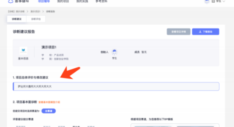 项目诊断建议报告的主要内容总体上可分为 「项目总体评价与修改建议、项目 基本面诊断、项目 BP 呈现诊断、实践指南」 四部分,后续将分别进行介绍。项目诊断建议报告第一部分 「项目总体评价与修改建议」 中会显示评委为当前项目给出的总体评价与修改建议,这一部分是评委评价完项目的基本面及 BP呈现后对项目情况的总结与补充评价。