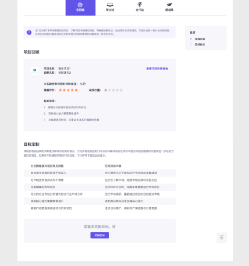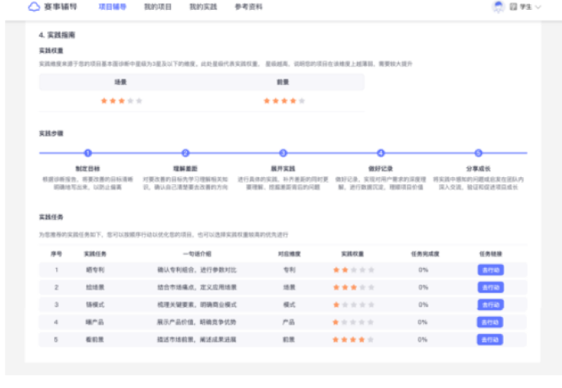 项目诊断建议报告第四部分 「实践指南」 中会显示系统根据评委诊断建议为项目自动匹配的实践指南,其中包含 「实践权重、实践步骤、实践任务」 三个小部分。