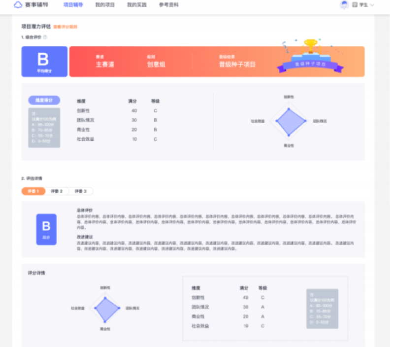 「评估详情」中会显示各个评委为当前项目给出的总体评价、改进建议及具体的评分等级,这一部分是为了明确详细的诊断评估数据以便后续项目改进时进行参考。