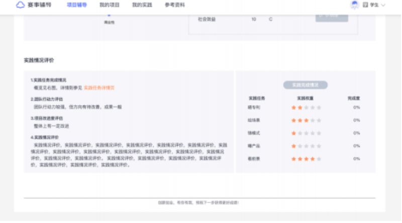 项目诊断评估报告第二部分 「实践情况评价」 中会给出当前项目团队在本次诊断中完成趣实践任务的情况及评委对其趣实践成果反馈的评价,这一部分是对项目在本次诊断中获得的趣实践任务成果的最终总结。