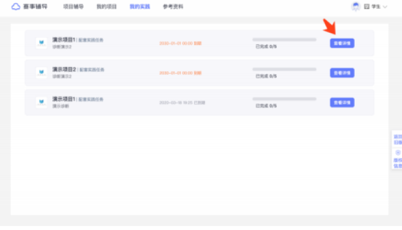 登录简创云平台( www.jc-cloud.com )并进入赛事辅导系统后,您可以在 「我的实践」 菜单下查看您作为创始人或项目成员的项目被分配的趣实践任务记录,点击 「查看详情」 则可进入相应的实践任务详情页。