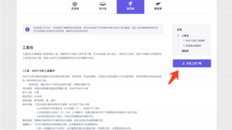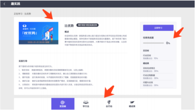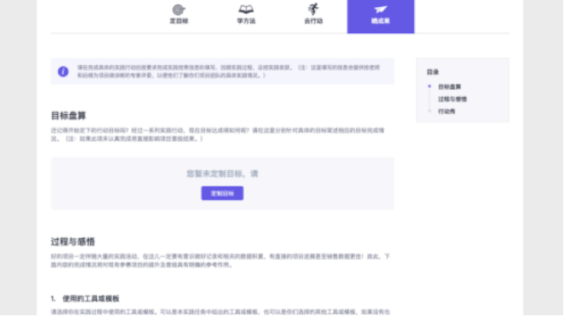 最后则是趣实践任务的具体内容,平台提供的所有趣实践任务的主要内容均可分为「定目标、学方法、去行动、晒成果」 四个模块,但不同趣实践任务在具体模块中提供的内容有所差异。