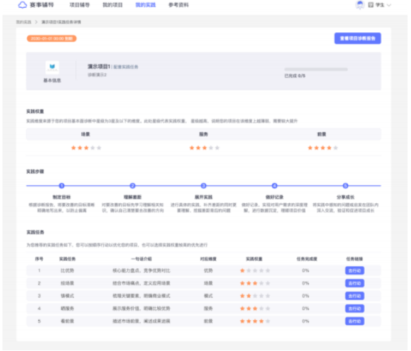为了帮助项目团队在获取诊断建议结果后更有效地对项目进行二次优化,平台针对系统中的所有项目基本面模型均提供了配套的趣实践任务。