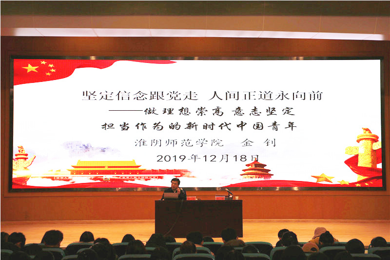 淮师新闻网 12月19日电(记者 陈远 黄典)12月18日晚,文学院在崇文楼音乐报告厅开展了新生入党导航教育活动。校工会主席、党史研究专家金钊老师主讲,文学院2019级全体学生及新党员参加了本次活动。文学院党委书记孙辉主持活动。