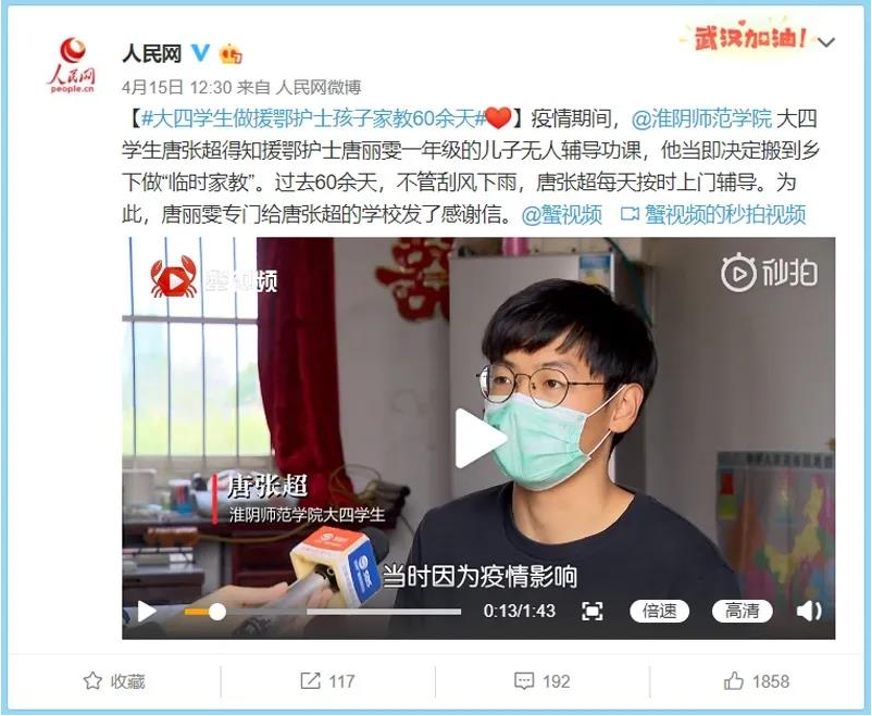 化学化工学院根据学校“停课不停教、停课不停学”和疫情防控的工作要求,有效组织扎实开展了各项教育教学工作。微信公众号推送“战‘疫’中的化工”系列微信,组织师生积极参加基层疫情防控工作,30余人参加疫情志愿服务活动,20余人给受疫情影响的孩子辅导功课,其中1605班唐张超给援鄂护士子女辅导65天功课的暖心事迹先后被央视新闻、人民日报海外版等媒体先后报道。