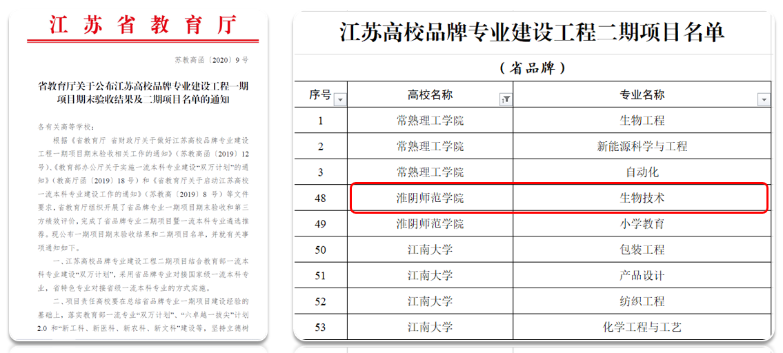 生物技术国家一流专业建设点获批江苏省品牌专业二期项目资助。学院多次组织专家论证,高质量完成了生物技术国家一流专业暨省品牌专业任务书。