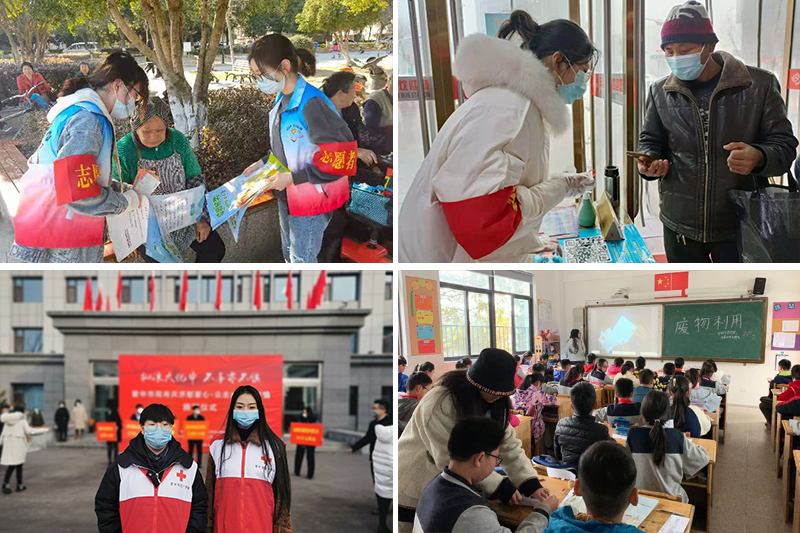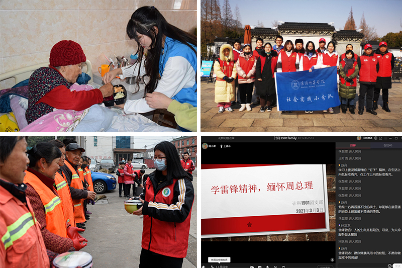 弘扬雷锋精神,争当时代楷模。城环学院凝爱志愿服务团走进与光同行自闭症儿童康复训练中心,和孩子们一起做游戏,开茶话会,在微笑中传递爱心,在奉献中感受快乐;体育学院组织青年志愿者走进社区和敬老院,向老人们宣讲健康防护知识,帮助老人们学习和理解科学合理健康的自我锻炼方式;外院组织青年志愿者在全国各地交通枢纽站点积极参与志愿服务活动,为外籍旅客提供购票引导咨询服务;化工学院“蒲公英”志愿服务团在徐州、宿迁、淮安等地新时代文明中心开展了“关爱留守儿童,构建和谐社会”系列活动,通过开展课业辅导、素质拓展、亲情陪伴等活动为孩子们送去一份温暖;法政学院通过组织青年志愿者在社区开展了“绿色共治,保护家园”垃圾分类知识宣讲活动,透过细致全面的宣讲,使广大居民对垃圾分类有了更深一层的了解;音乐学院引导青年学生积极参与地方疫情防控工作,在实践中扬青春风采、担时代责任。