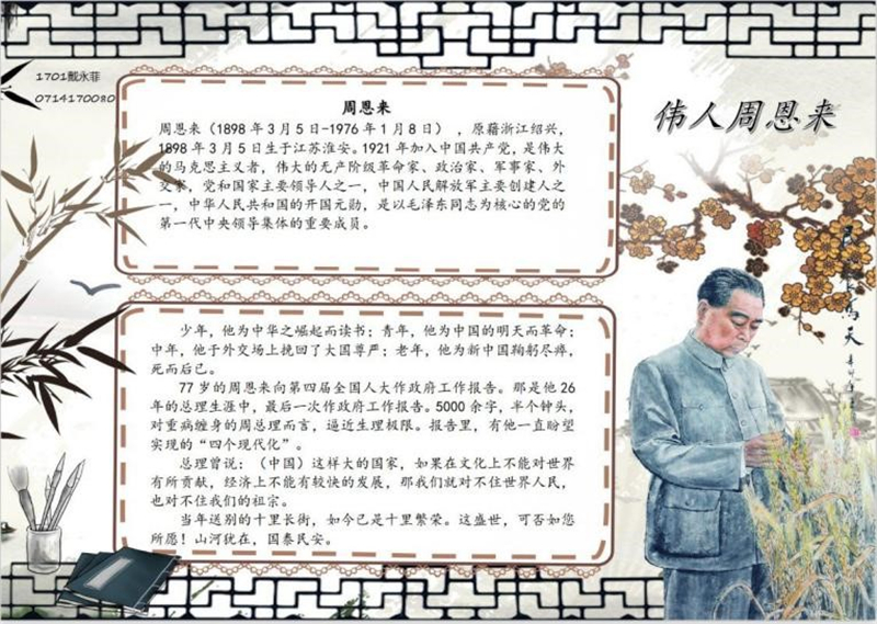 指尖笔下承情,恩来精神流芳。历史学院学子们别出心裁,在家中和父母,和兄弟姐妹共同绘制关于纪念周总理的主题手抄报,将学习周恩来精神融进家风建设中。教科院、美术学院,城环学院、法政学院的学子们通过书法、绘画、三行诗、简报等形式开展了主题纪念活动。画笔传情,一幅幅总理肖像画栩栩如生,总理音容相貌在学子们挥毫落纸之间浮现;一张张简报、手抄报制作精美,一个个剪纸灵动新奇,无声讲述着周总理的一生,饱含学子对总理的怀念;一句句总理经典语录“为中华之崛起而读书”“大江歌罢掉头东”“愿相会于中华腾飞世界时”等,承载着学子们对传承周恩来不朽精神的决心。