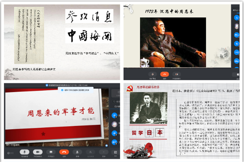 光影流转,往事可追。外院学子结合专业特色,自制各式视频交流分享总理学习外语的故事,在镜头下开放交流,穿过历史隧道体验总理面对学习困难的无畏刻苦,给学生精神上的激励;生科院、物电学院学子们通过相约线上观影《周恩来的四个昼夜》《海棠依旧》《周恩来回延安》等经典影视作品,直观领略和感悟总理的伟大风范和人格魅力。数统学院学子通过观看扶贫剧《山海情》,结合阅读周恩来经典文章《加强老根据地的建设》,在历史脉络里探寻总理的全心全意为人民服务的伟大初心,在感叹中国发展的沧桑巨变中,呐喊出“这盛世中华,如总理所愿”。