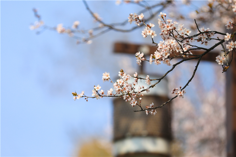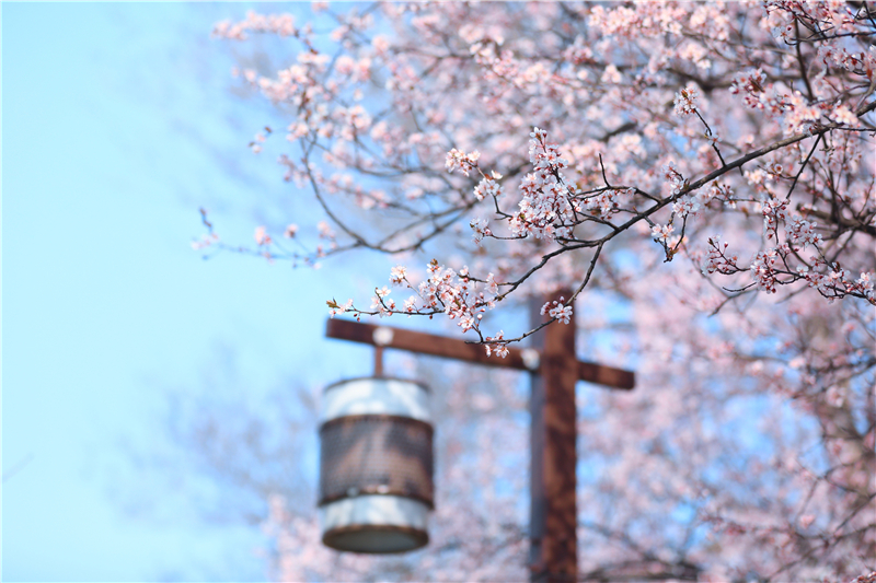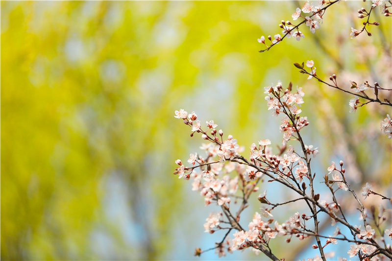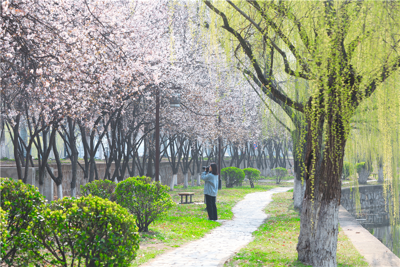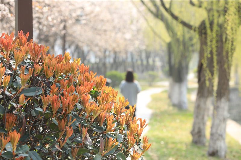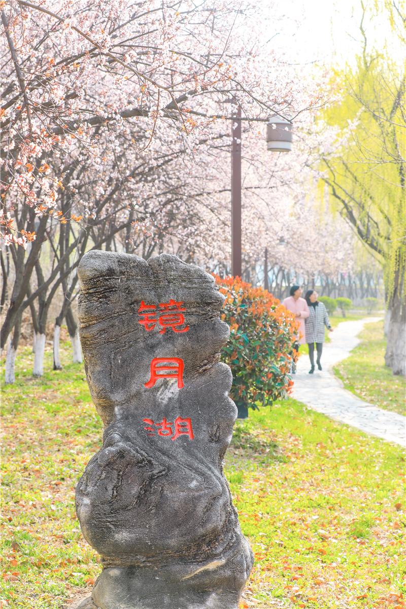 :淮师镜月湖胖的紫叶李花开了,同学们驻足欣赏,一树一树的浅粉,仰望璨灿柔亮如碎银,远望如云团。同学们从树下的小路上经过,普通的行走也有了诗意!