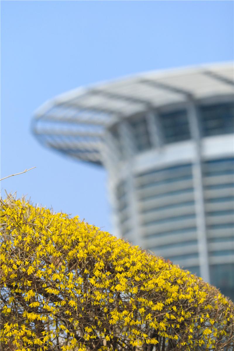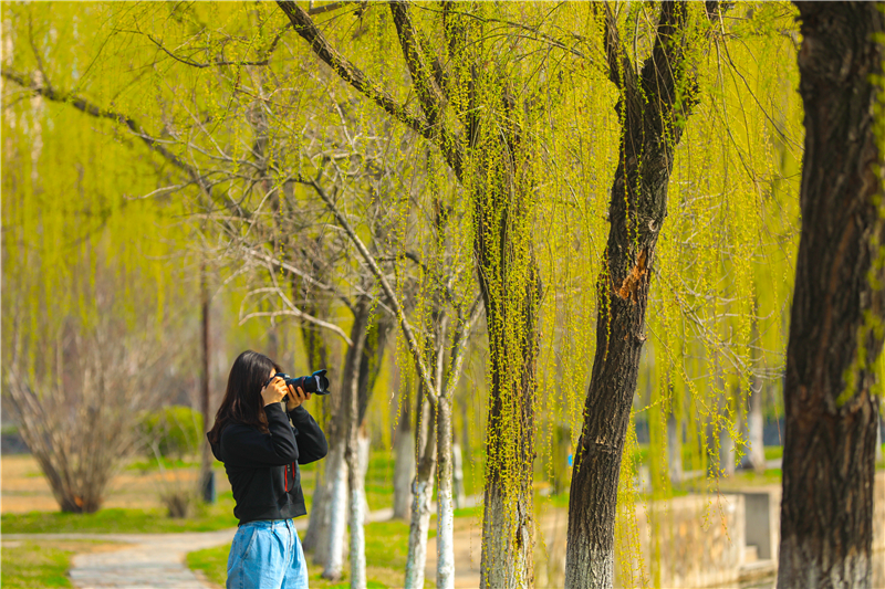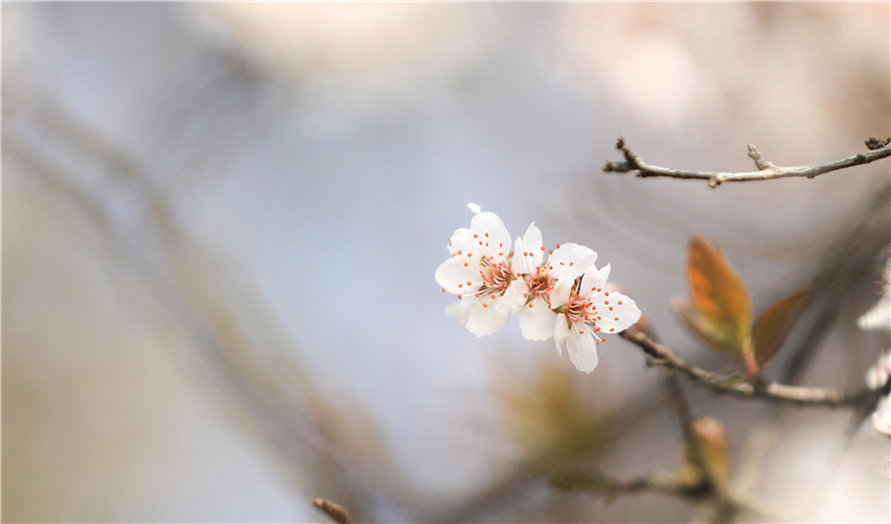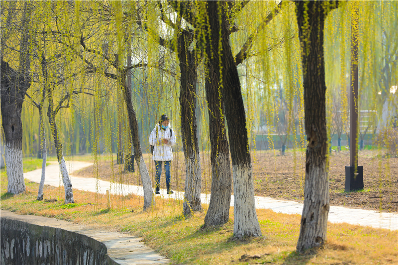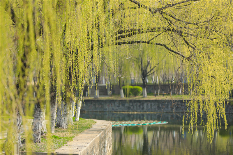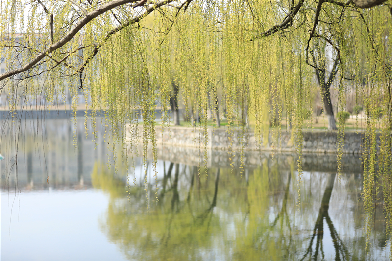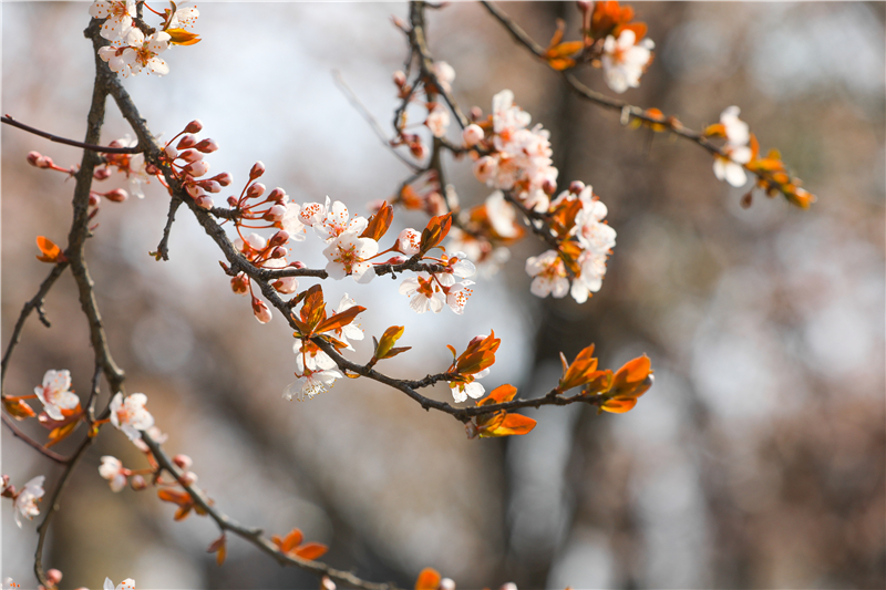 :淮师镜月湖胖的紫叶李花开了,同学们驻足欣赏,一树一树的浅粉,仰望璨灿柔亮如碎银,远望如云团。同学们从树下的小路上经过,普通的行走也有了诗意!