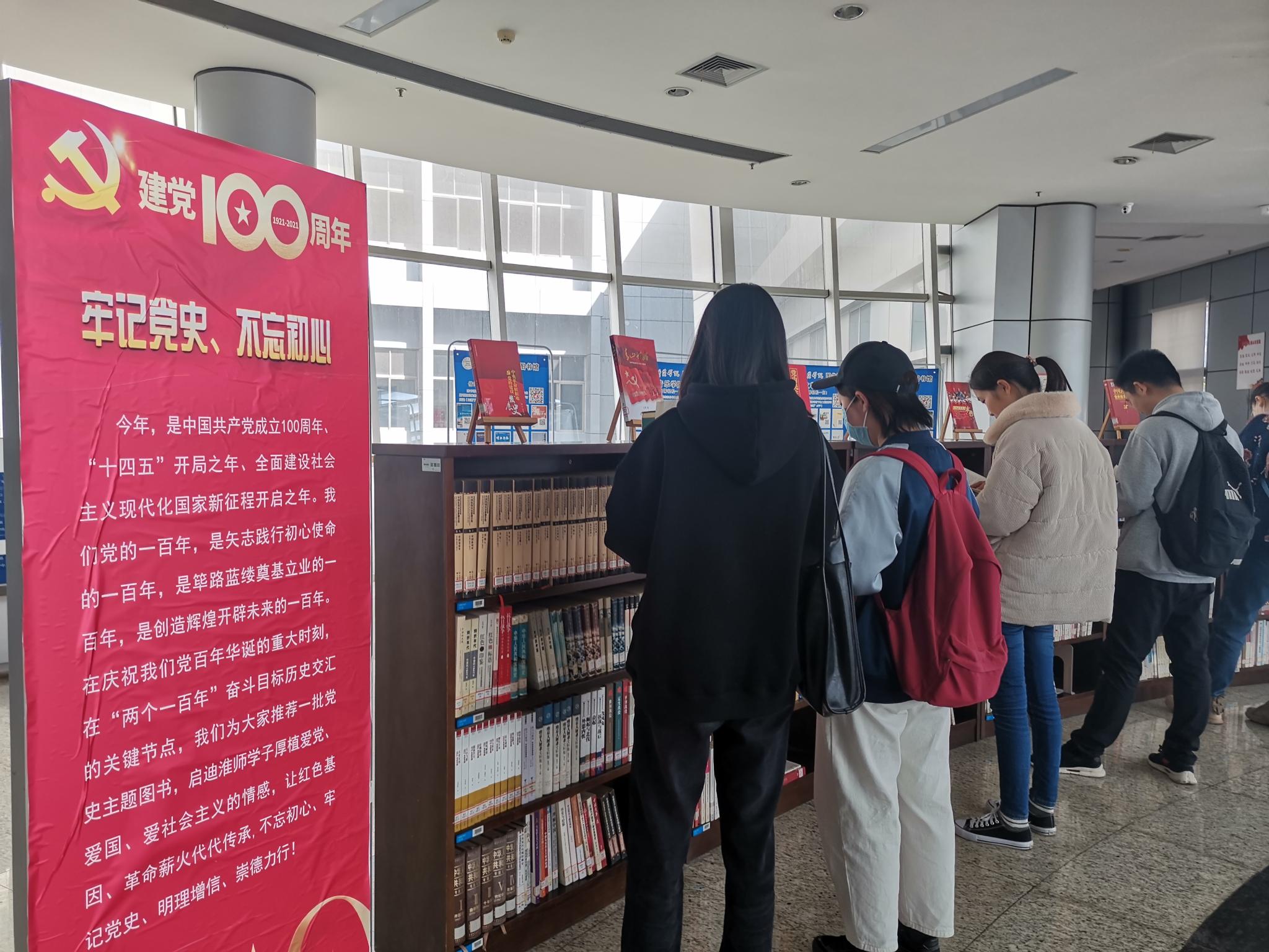 在图书馆大厅图书展示架上,陈列着图书流通室老师和学生在两校区图书馆馆藏中精心筛选的1200余册,以党史为主,兼顾新中国史、改革开放史、社会主义发展史的文献书籍。《共产党宣言》《毛泽东选集》等老一辈无产阶级革命家的经典著作,《习近平谈治国理政》《中国共产党历史》《创建伟业——中国共产党成长发展史研究》等畅销党建读物,有序展开,象征着中国在中国共产党的带领下,高举共产主义旗帜,从一个胜利走向另一个胜利,一路走向辉煌。