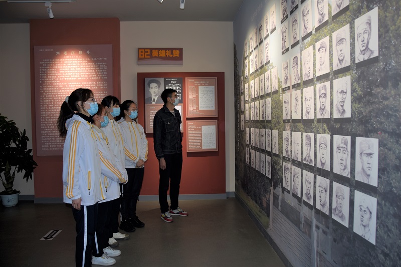 在讲解员的带领下,同学们实地参观了八十二烈士纪念馆,观看了宣传教育图片和战争遗物,了解了抗日战争的惨烈和胜利的来之不易,党员们齐聚刘老庄八十二烈士陵园纪念碑前,齐声诵读诗歌《在烈士墓前》,表达对抗日战争中牺牲的八十二位烈士的哀思。随后学生党员们排着整齐的队伍,向纪念碑敬献了花篮和白菊花,并默哀三分钟。
