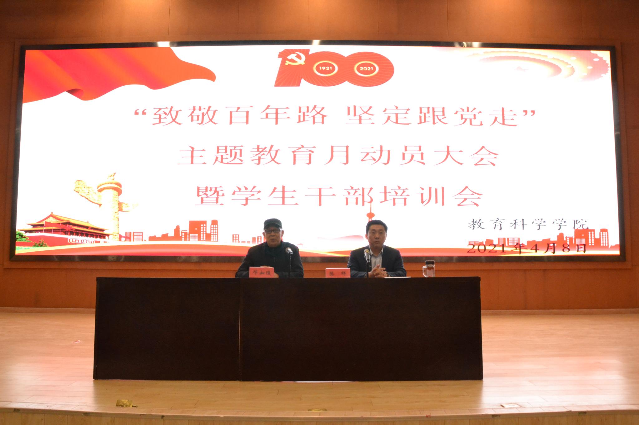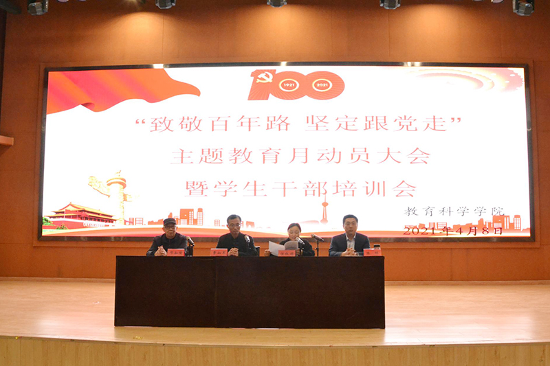 淮师新闻网4月9日电(记者 吴雪纯 肖箫 武美贤)4月8日晚,教育科学学院于崇文楼106报告厅召开“致敬百年路 坚定跟党走”主题教育月动员大会暨学生干部培训会。会议由学院党委副书记滕祥主持,教科院院长曹如军、副院长任红娟、关工委常务副主任邓如陵、全体辅导员及教科院全体学生干部参加了会议。